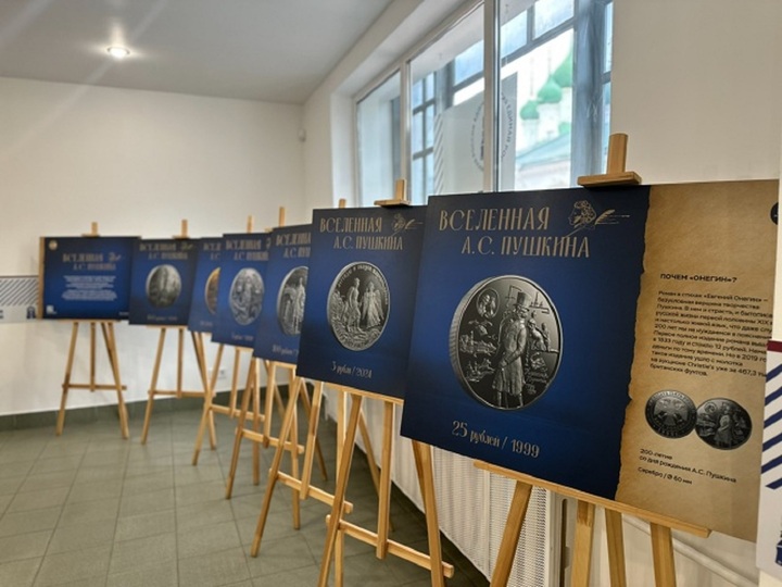 В экспозиции будут представлены увеличенные фотографии юбилейных монет с изображением А.С.Пушкина, выпущенных Банком России.