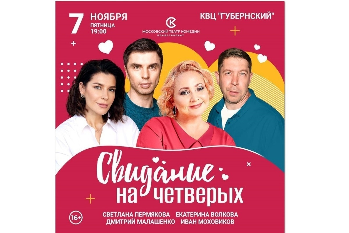Администрация КВЦ «Губернский» сообщает об антрепризе актеров Московского театра комедии, которые 7 ноября выступят перед костромской публикой в спектакле «Свидание на четверых».