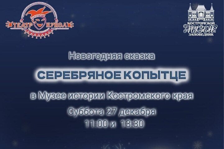 Костромской музей-заповедник и труппа Театра кукол приглашает детей и их родителей на спектакль «Серебряное копытце», который будет представлен в Музее истории Костромского края, (известного также как Дом губернатора, что на ул. Дзержинского, 9б ). После спектакля малышей ждет мастер-класс по созданию необычной гирлянды и на настоящий праздник с ёлкой. Представления будут даны 27 декабря в 11:00 и в 13:30, возрастных ограничений нет.