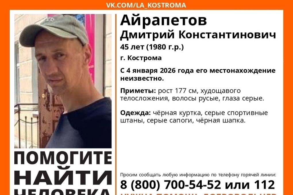 45-летний Дмитрий Айрапетов из Костромы, несколько дней его местонахождение неизвестно. Он бесследно исчез в самый разгар новогодних праздников.