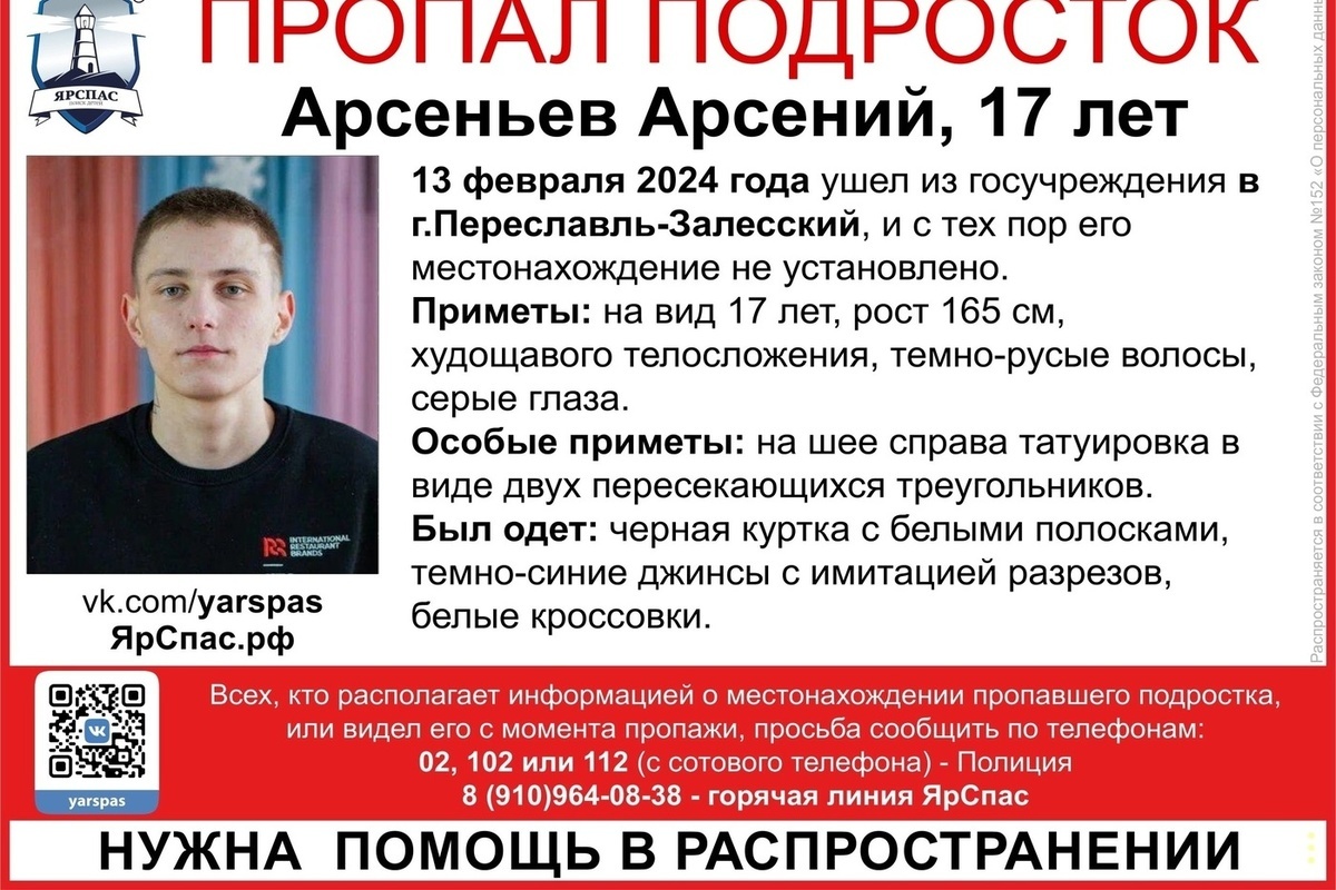 17-летний Арсений Арсеньев ушел из государственного учреждения в Переславле-Залесском еще 13 февраля, и с тех пор о его местонахождении ничего неизвестно.