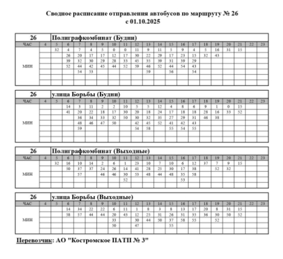 Костромское автотранспортное предприятие ПАТП-3 уведомляет жителей областного центра о том, что с сегодняшнего дня 1 октября автобусный маршрут №26, обслуживающий линию «Полиграфкомбинат – улица Борьбы» переходит на осенне-зимние расписание, которое будет действовать как по будним, так и по выходным дням до апреля 2025 года.
