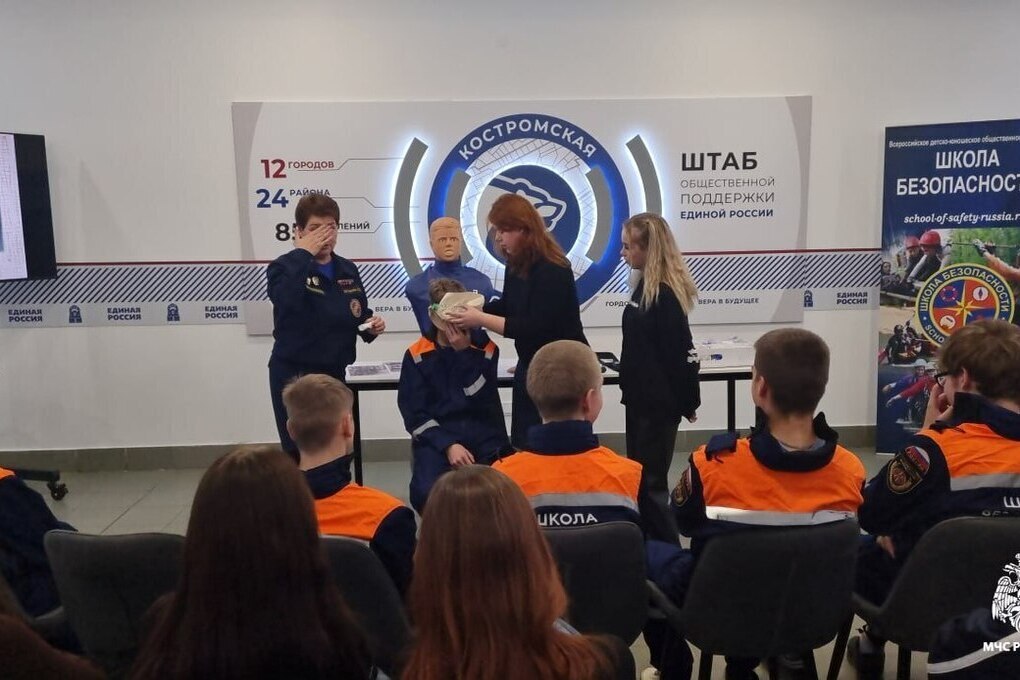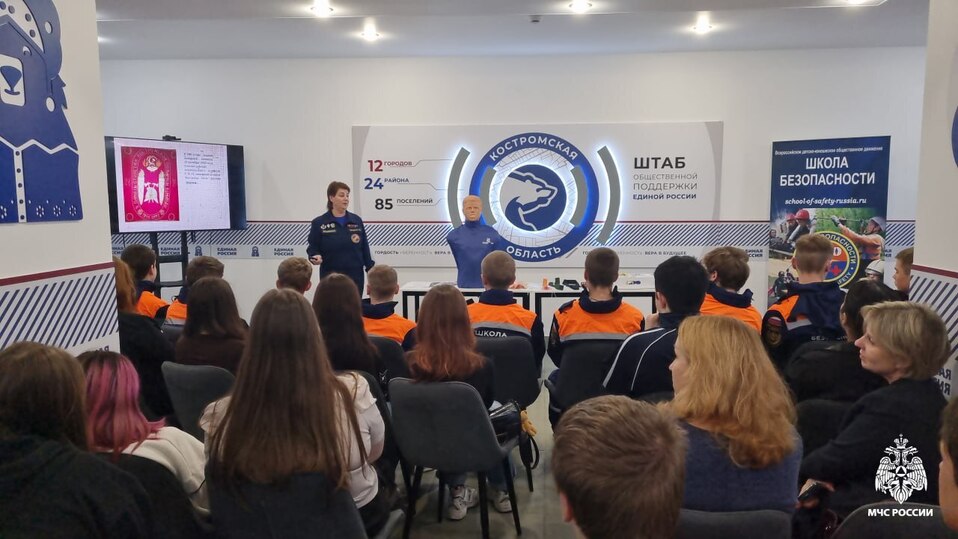 28 октября в Штабе общественной поддержки огнеборцы провели открытый интерактивный урок, на котором рассказали студентам костромских техникумов о том, как следует вести себя при различных чрезвычайных ситуациях и как, если что оказать медицинскую помощь пострадавшим и, если придётся, самому себе. Молодым людям показали как можно остановить кровотечение, как наложить повязку, как зафиксировать сломанную конечность и чем можно помочь пострадавшим при ожогах.