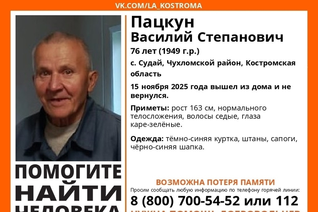 Три дня назад, 15 ноября, в Костромской области пропал пенсионер Василий Пацкун. Мужчине 76 лет, он из села Судай Чухломского района.