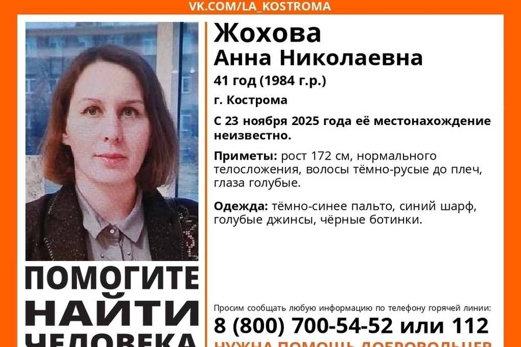 Если у вас есть информация о местонахождении женщины, или вы хотите принять участие в поисках жительницы Костромы, звоните: Чайка (Ирина), т. 8 (915) 918-68-32 и Нюся (Светлана), т. 8 (910) 661-59-07.