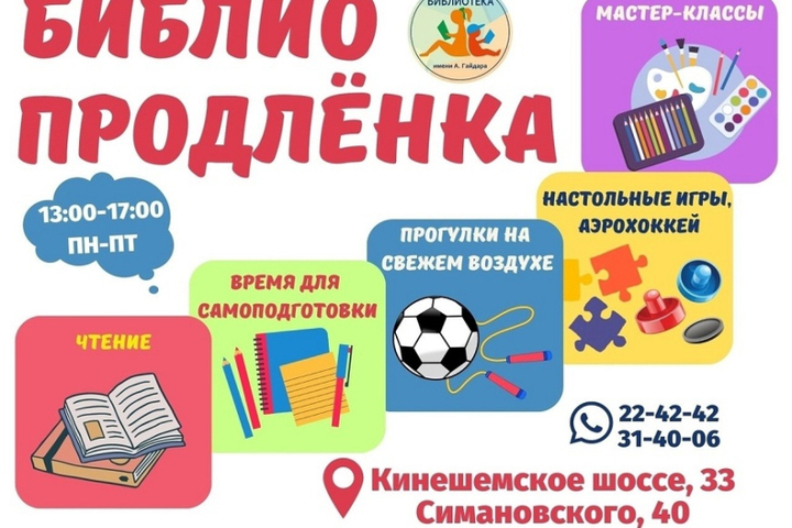 «Библиопродлёнка» — это современное интерактивное пространство на базе муниципальных библиотек, где дети находятся под присмотром, пока родители заняты на работе. Ежедневная программа «Библиопродленки» включает четыре основных модуля: время для чтения книг, выполнение творческих заданий и настольные игры, а также подготовка домашних заданий.