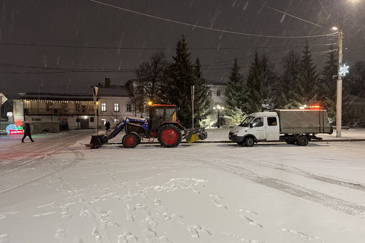 В течение дня планируется повторная обработка реагентами и уборка снега с ключевых маршрутов города. В настоящее время ведется уборка лотковой зоны на площади Широкова, вокруг Торговых рядов.