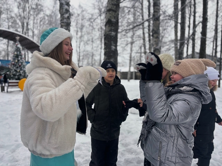 Детишек разделили на несколько команд, где они кидали валенки, рисовали на снегу, искали новогодние шары, примеряли на себя образы сказочных героев и танцевали морозные танцы. Русские забавы по станциям располагались по всему периметру новогоднего парка.