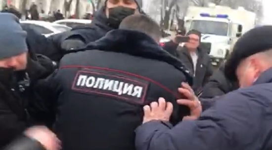 В Костроме представители внесистемной оппозиции участвующие в акции "В поддержку Навального" напали на полицейских. На видео видно как сразу несколько мужчин напав на сотрудника силовых структур пытаются повалить его на землю. На видео видно, что к месту происшествия подъезжает полицейская машина и включает сирену. Чем закончилось это нападение не известно, видео обрывается.